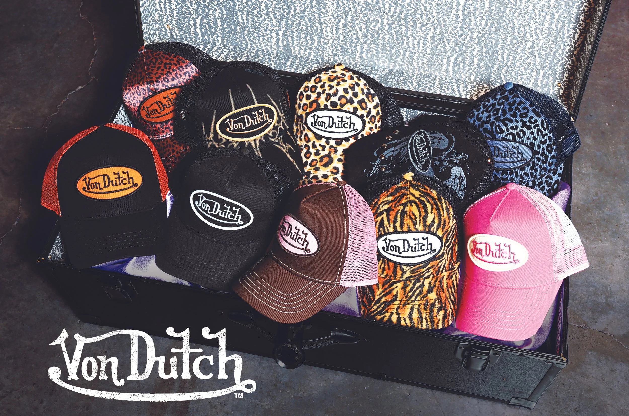 A black box filled with various Von Dutch trucker hats featuring animal print, leopard, tiger, and solid colors, some with mesh backs, sitting on a concrete floor.